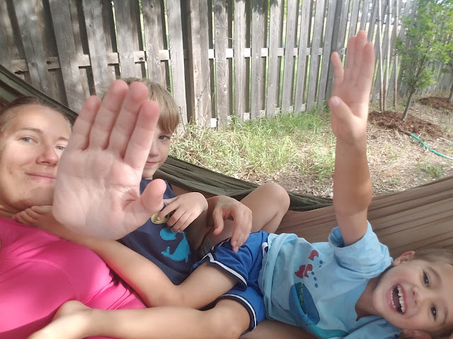 We're going to end with some happy pictures (not that the rain picture isn't happy- for me it is). The boys and I enjoyed the hammock a bunch yesterday and took some goofy shots.